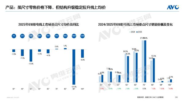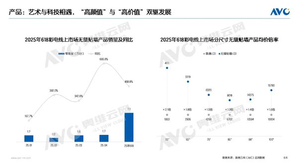 奥维云网数据显示,2025年618促销期间(2025.05.12-06.22)中国彩电市场销量达398万台,较去年同期增长9.7%;销售额为173亿元,较去年同期增长14.5%。其中线上市场销量达295万台,较去年同期增长8.9%,销售额为102亿元,较去年同期增长13.3%;线下市场销量达103亿元,较去年同期增长11.9%,销售额为71亿元,较去年同期增长16.3%。