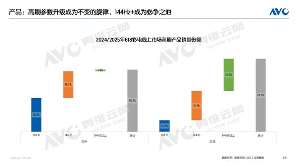 从数据可以看出,国内彩电产品结构升级趋势显著:线上市场98英寸及以上产品销量达5.9万台,同比增长高达133.3%,98、100英寸及以上销量分别同比增长0.8%、0.9%;MiniLED线上销量份额达41%,较去年同期增长22.1%;144Hz及以上产品份额提升,产品销量份额为31.4%,144HZ以上产品销量份额为34.6%,与去年同期相比分别提升2.9%、32.8%。