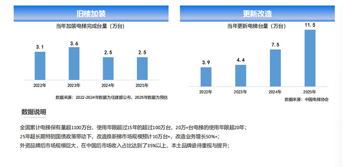 不过,这并不意味着电梯市场步入冬季。《中国电梯协会》公布数据显示,目前全国累计电梯保有量超1100万台,其中使用年限在15年以上的超过100万台,超20年则在20万台以上。随着国家层面积极推动既有建筑节能改造和大规模设备更新,旧梯改造、换新的存量蓝海已然显而易见。