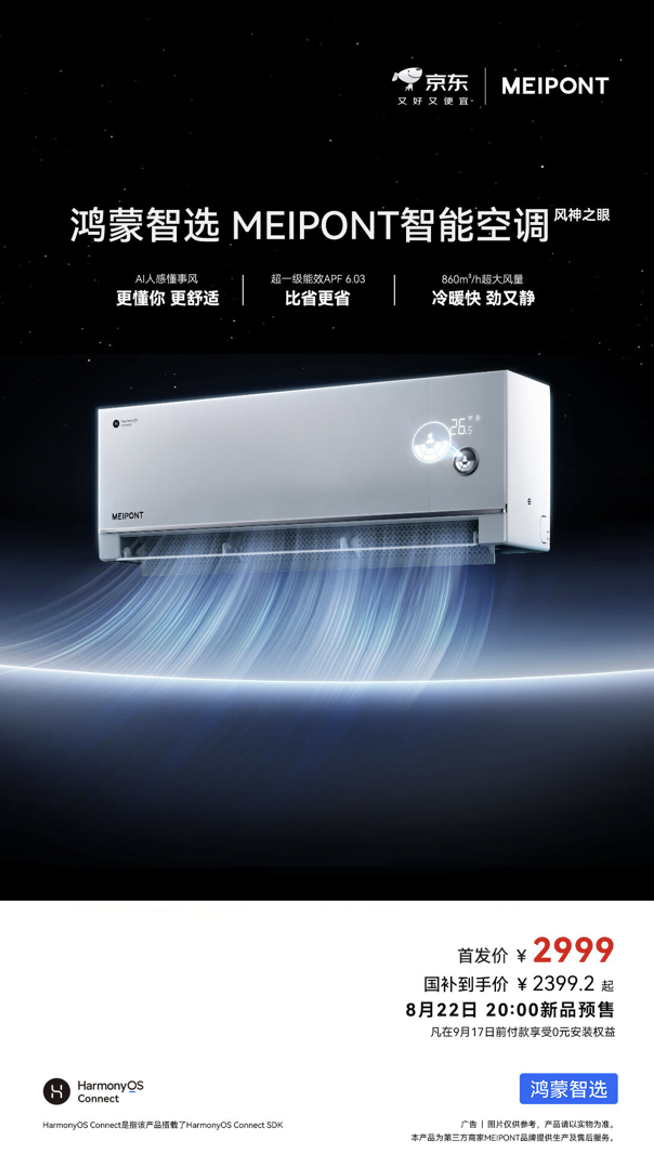 这款鸿蒙智选MEIPONT智能空调风神之眼将于8月22日在京东全球独家首发销售,目前已全面开启预售,打开京东App搜索“风神之眼新品日”即可预约购买享受多重首发权益。与此同时,京东服务正式成为鸿蒙智选MEIPONT智能空调风神之眼的战略合作伙伴,京东将构建更完善的服务网络,以稳定订单保障工程师权益,赋能品牌,共同引领行业升级,成为消费者最值得信赖的服务伙伴。