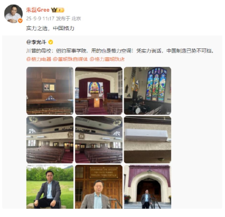 9月9日,品牌战略专家李光斗发微博,川普的母校:纽约军事学院,用的也是格力空调!凭实力说话,中国制造已势不可挡。