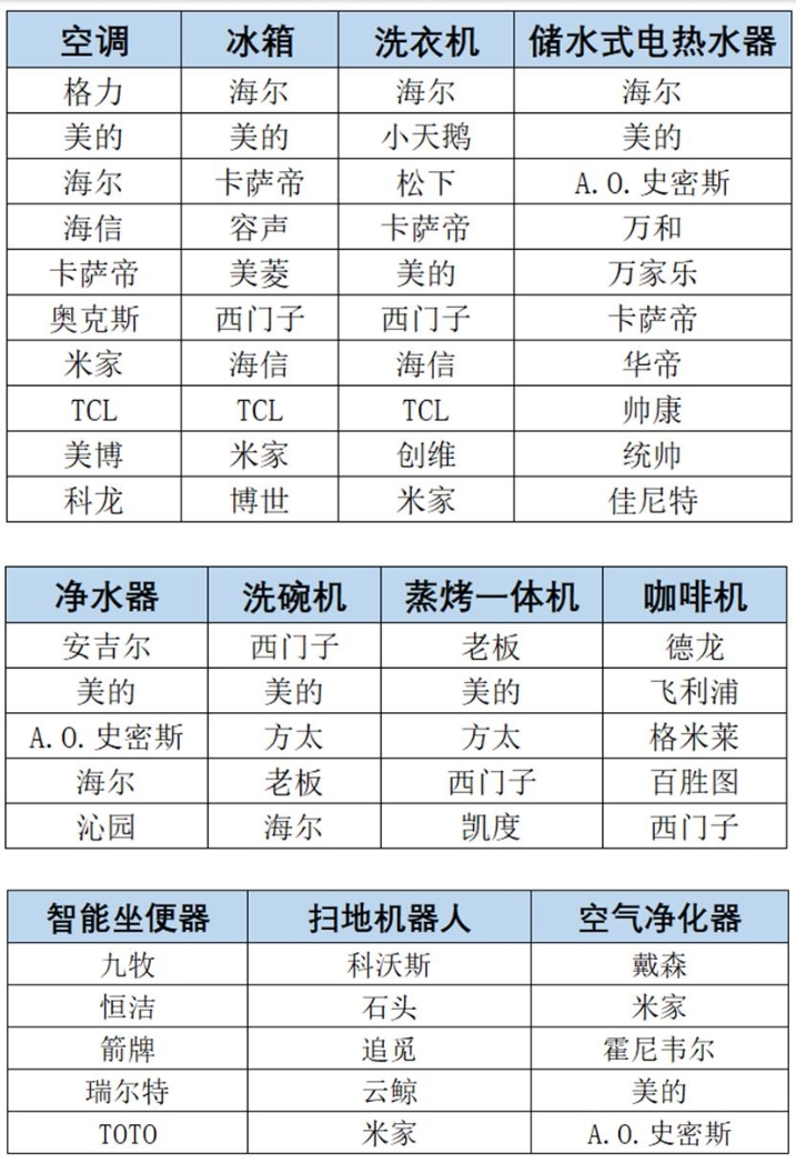 2025年9月5日,由工业和信息化部消费品司支持、中国家用电器研究院主办的“2024-2025年度中国家用电器行业品牌评价活动”在“2025柏林国际电子消费品展览会(简称IFA)”开幕首日举行了现场发布仪式。本届评价覆盖11大类家电产品,共有空调、冰箱、洗衣机、储水式电热水器4大类各10个品牌,净水器、洗碗机、蒸烤一体机、扫地机器人、咖啡机、智能坐便器、空气净化器7大类各5个品牌入选。