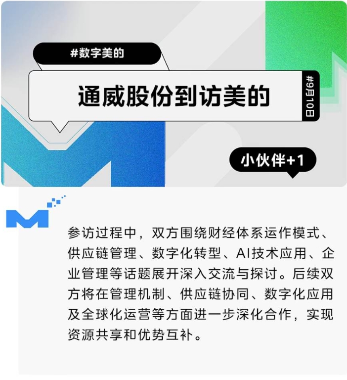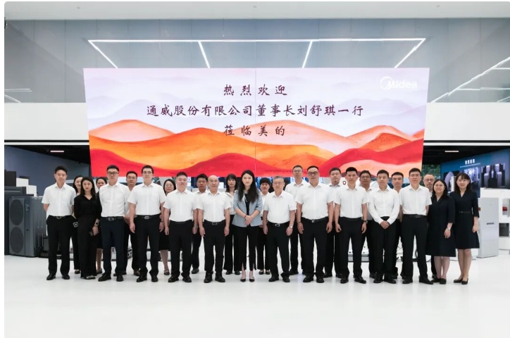 此前,美的集团与通威股份签订了战略合作协议,双方在光伏行业数字化、机器人及物流自动化、智慧楼宇、物流服务等领域展开全面深度合作。此次来访,不仅加深了通威股份对美的在战略布局、数字化转型等方面的了解,更为双方未来在数字化等多个领域合作夯实了前行基石。