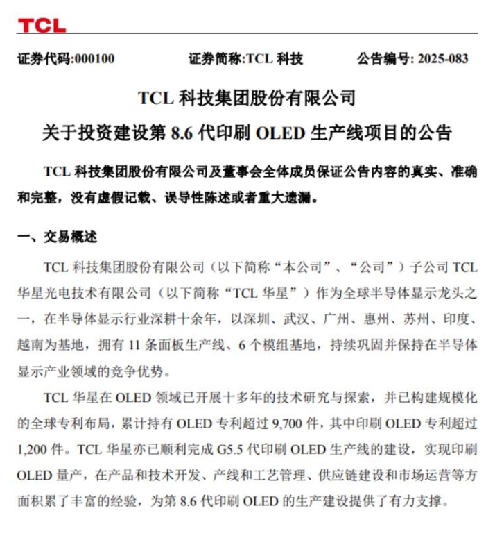t8项目将落户广州市,建设一条月加工2290mm×2620mm玻璃基板能力约2.25万片的第8.6代印刷oled生产线,主要产品涵盖平板、笔记本电脑、显示器等领域。项目由新成立的广州华星光电印刷显示技术有限公司(简称“项目公司”)负责建设和运营,该公司于2025年8月注册成立,目前由TCL华星100%持股,注册资本10亿元。