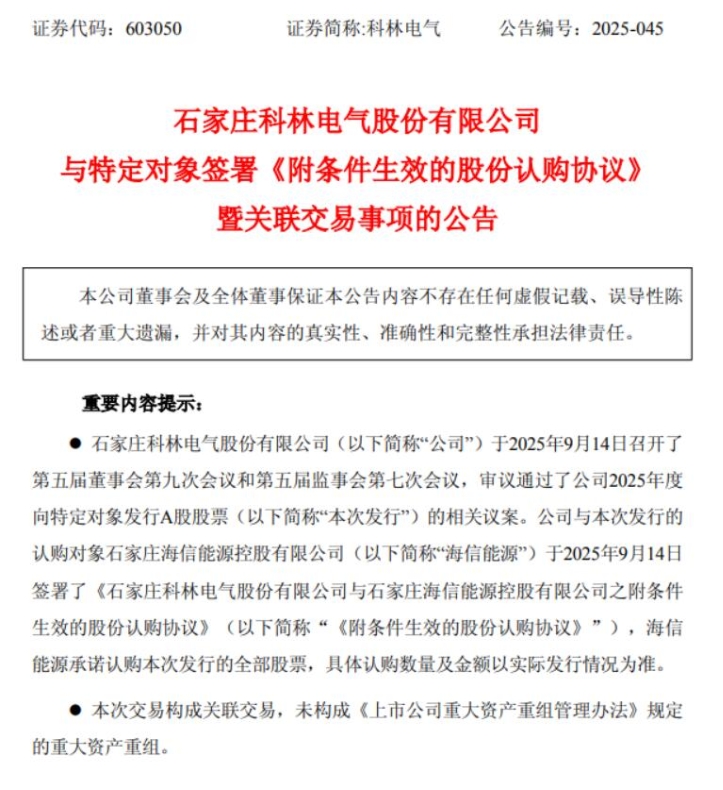 9月14日晚间,科林电气发布定增预案,拟向特定对象发行股份募资不超15亿元,扣除费用后全用于补充流动资金。此次非公开发行由海信能源全额认购,为锁价发行,价格16.19元/股,较收盘价折价约4%。海信能源是海信集团控股公司子公司,交易构成关联交易,股份锁定期36个月。海信能源主营机械电气设备等制造,成立于2025年9月12日。若按上限发行,发行后海信集团控股公司间接控股权升至54.87%,公司仍无实控人。科林电气称,定增补充流动资金利于优化研发等,目前公司融资以贷款为主,资产负债率62.33%,发行可优化结构等。近年智能电网发展好,科林电气业务指标稳健增长,未来将探索新技术应用,开展多领域研发。