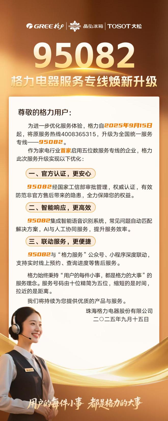 中国家电行业最短服务号来了!9月15日,格力电器正式宣布,全国统一售后服务专线全面升级为“95082”。该号码将作为格力官方唯一客服专线,面向全国用户提供更加高效、便捷、智能的售后服务支持。据了解,格力电器是家电行业首家启用5位数客户服务专线的企业。