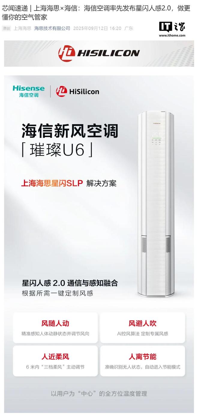 海信空调即将上市的新风空调璀璨 U6,基于上海海思星闪 SLP 解决方案,以“通感一体”为核心,在感知人体状态的基础上实现精准送风。