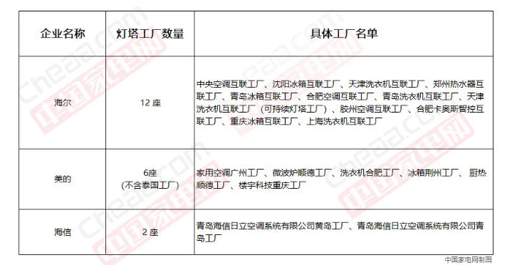 在这29家家电行业“灯塔工厂”中,海尔拥有12座,是全球拥有灯塔工厂数量最多的家电企业,美的拥有6座灯塔工厂(不含泰国工厂),海信则拥有2座灯塔工厂。