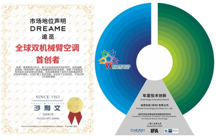 追觅空调创新的“双机械臂驭风技术”凭借其突破性研究,已连续荣获沙利文“全球首创认证”与中国家用电器研究院“年度技术创新成果”两项大奖。
