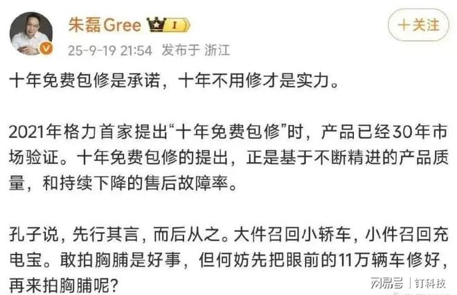 钉科技注意到,2021年,格力电器率先在行业推出“整机十年免费保修”政策,覆盖所有家用空调品类与零部件,不设任何额外限制。董明珠曾公开表示,格力空调的故障率已控制在万分之三的极低水平。
