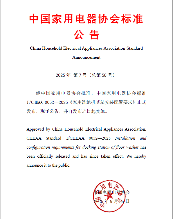 9月25日,中国家用电器协会标准T/CHEAA 0052—2025《家用洗地机基站安装配置要求》正式发布。