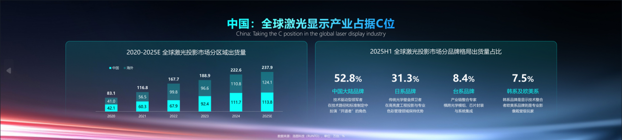 据洛图科技(RUNTO)数据,2020-2025年激光投影市场复合增长率高达23.4%,2025年全球出货量预计达237.9万台,其中中国市场占据近半壁江山,增速尤为惊人——2025年上半年,中国百寸以上激光电视出货量同比激增177%。这一曾被视作“专业设备”的产品门类,正以高速度进入大众消费领域。
