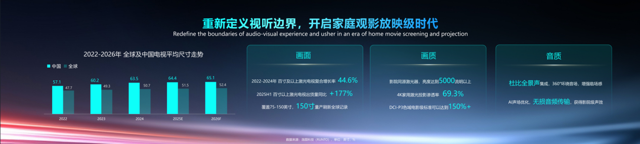 另一方面,产品形态发生关键变革——海信推出全球最小4K激光电视,主机体积缩减60%;此外,激光投影其他品牌及相关配套服务器企业近年来推出了:可折叠幕布、云台设计及触控一体化方案大幅降低百寸大屏的入户与使用门槛。更重要的是,随着光学方案成熟与产业链规模扩大,激光投影成本持续下探,75-150英寸全矩阵产品覆盖,让更多家庭消费成为可能。