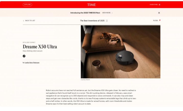 10月9日,美国《时代周刊》(Time)公布2025年“Best Inventions of the Year”(年度最佳发明榜单),揭晓了备受关注的年度最佳产品。追觅扫地机X50 Ultra凭借突破性的仿生机械足技术和卓越的创新实力入选,成为此次唯一上榜的扫地机产品。