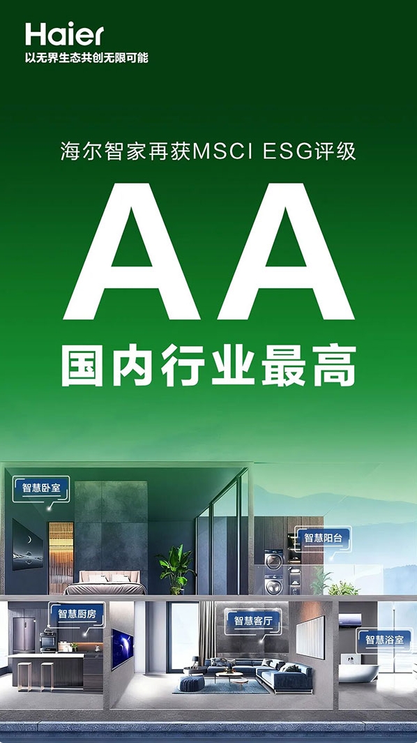 近日,国际权威指数机构摩根士丹利资本国际公司(中文简称“明晟”,英文简称“MSCI”)公布了最新ESG评级结果,海尔智家再次获评AA级,国内行业评级最高。