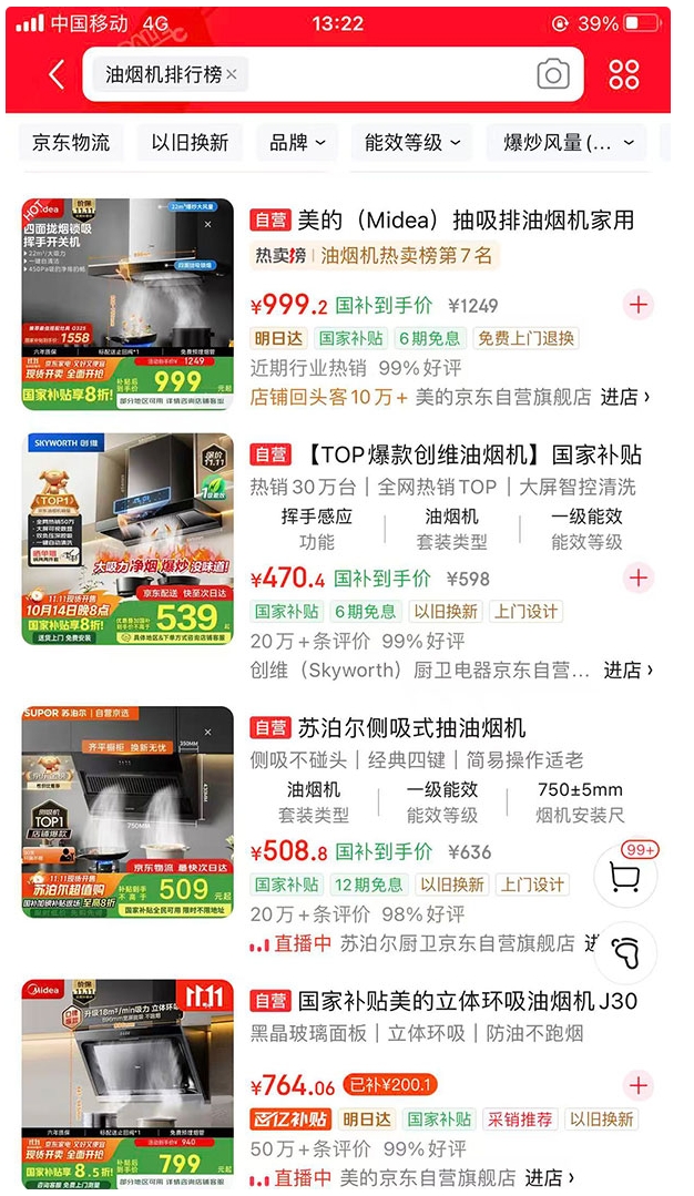 从各大平台综合信息获知,广东某一线品牌,欧式烟机风量21m³/分,补贴后价格仅为695元,同是广东的、同样是一线品牌,22m³/分的带智能清洗功能的补贴价之后不足1000元。