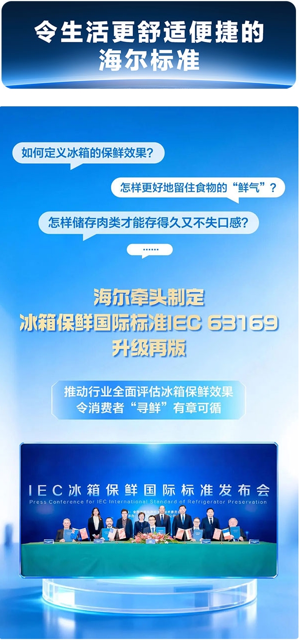 基于对消费者“吃得更新鲜”的需求洞察,2020年海尔发布了全球首个冰箱保鲜国际标准IEC 63169,引导冰箱评价维度从“存得住”向“存得鲜”转变。随着时代发展,消费者对冰箱储鲜的要求也在不断提升。海尔联合16国专家针对失重、凝露等痛点启动再版研究,通过3000多组实验,于2024年底成功推动该项标准再度进化,为用户带去更好的储鲜体验。