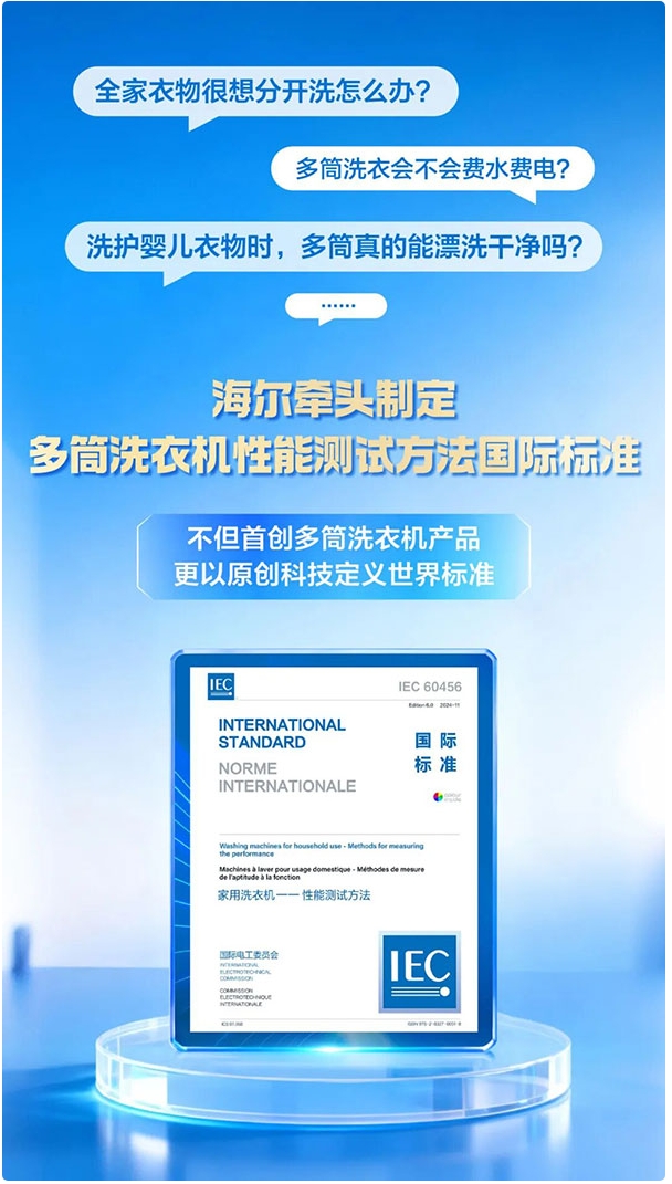 2015年-2025年,从推出全球首款一机双筒洗衣机,到发布爆款懒人三筒洗衣机与全球首台一机四筒洗衣机,海尔在多筒洗衣机赛道始终领跑。不仅创新产品,海尔还将原创科技化为国际通用的技术准绳——2024年底,海尔牵头发起和制定的世界首个多筒洗衣机性能测试方法国际标准正式发布,从此多筒洗衣机的测试方案和负载配置原则有了详细规定,为这项“中国洗护智慧”出海保驾护航。