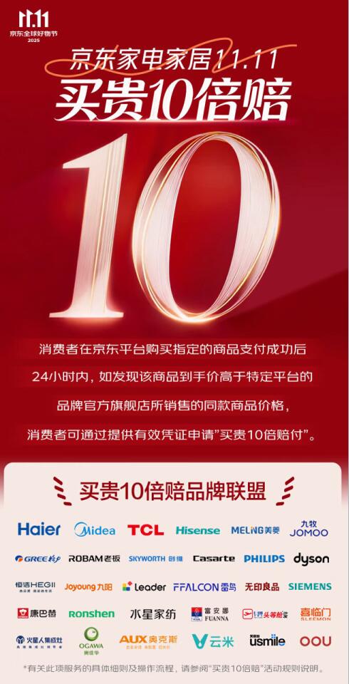 10月14日20点至11月11日24点,消费者在京东购买带有“买贵10倍赔”标识的商品,如发现价格高于指定平台同款,可在京东APP“我的订单—订单详情”联系客服提交资料,经审核通过后,按1:100比例将差价以京豆形式返还至账户。打开京东APP,搜索“买贵10倍赔”,即可轻松参与,解锁更多低价家电家居好物。