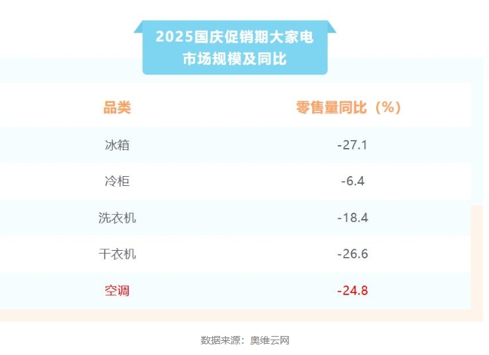 回到近期的市场行情,奥维云网(AVC)推总数据显示,2025年国庆促销期(25W38-40),中国冰箱、洗衣机、空调市场零售量分别为216、286和262万台,同比降幅27.1%、18.4%和24.8%;零售额分别为91、82和93亿元,同比降幅32.6%、23.3%和32.1%,价格同比走低。
