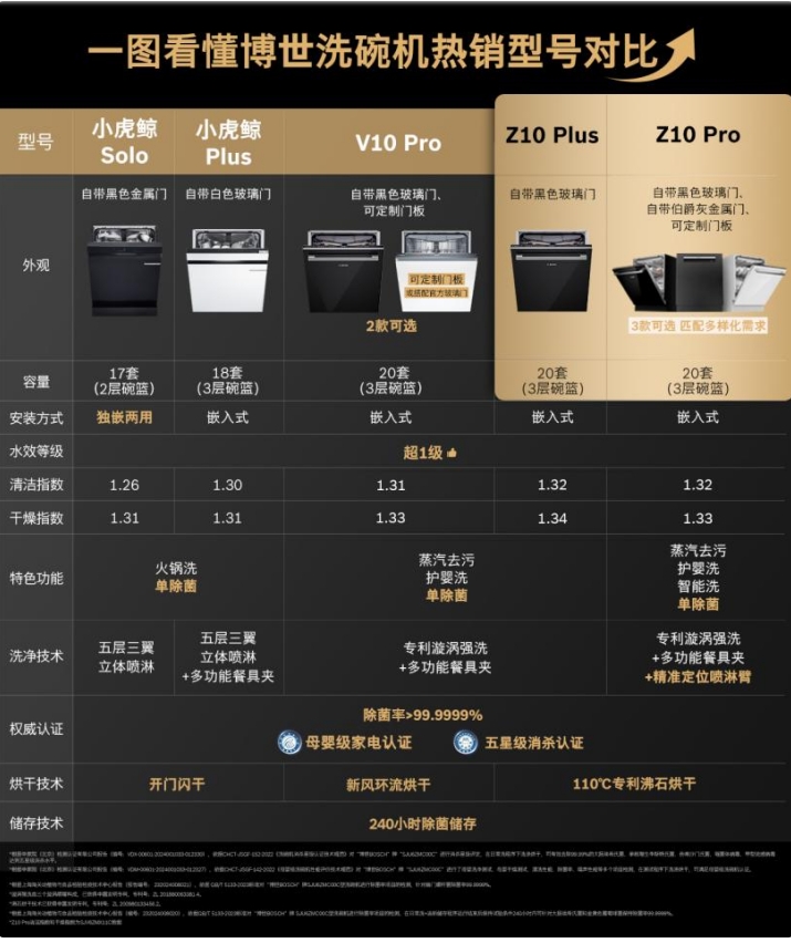 针对中国家庭结构和小型化厨房趋势,博世家电推出的五款产品在容量、安装方式和核心功能上形成精准区分。其中,“小虎鲸Solo”采用独嵌两用设计,配备五层三翼喷淋系统和5分钟开门闪干技术4,其灵动碗篮可实现4锅同洗,满足年轻家庭灵活安装与快速清洁需求;“小虎鲸Plus”以18套超大容量和质感玻璃门板为特色,搭载自动开门闪干技术4,三键前脸触控设计兼顾美学与实用;专为母婴家庭打造的“V10 Pro”具备20套顶配容量,并创新推出宝宝餐具洗涤程序,配合新风环流烘干系统5,重新定义了健康家居的新标准;高端系列中的“Z10 Plus”主打“六边形战士”全能定位,以沸石烘干技术6和240小时长效存储,打造全能型洁净体验;而同系列的“Z10 Pro”在保持沸石烘干6与20套大容量的基础上,强化精准定位洗涤功能,搭载三叉旋臂系统实现4倍水流定点冲刷。并提供多样化定制门板选择,满足用户对个性风格与卓越性能的双重追求。