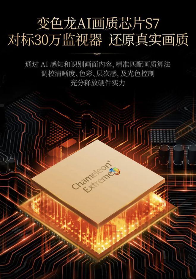 在技术上,创维变色龙显示技术平台融合了AI画质芯片、量子点广色域等模块,形成软硬一体的解决方案。比如,最新的变色龙AI画质芯片S7能精准识别内容源质量,对低分辨率或者“伪4K”内容进行智能修复,同时还会避免过度计算导致的画面失真。这种“克制的AI”理念,也体现了创维对画质还原的坚持。