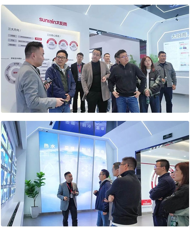会谈之余,在太阳雨集团总裁陈荣华的陪同与讲解下,代表团参观了太阳雨清洁能源展厅,详细了解了太阳雨在空气能、太阳能等清洁能源技术方面的产品矩阵与系统解决方案。通过对太阳雨“零碳园区”的实地考察,京东代表团对太阳雨领先的零碳实践能力有了更为直观的认识。此次深入探访,增强了双方合作的信心,为未来共同探索在零碳园区建设、绿色供应链打造乃至面向消费者的低碳生活解决方案等更广阔领域的协同创新,开辟了巨大的想象空间与合作可能。
