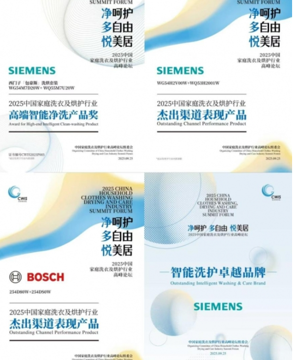 9月25日,由中国家电网主办的“净·呵护 多·自由 悦·美居 2025中国家庭洗衣及烘护行业高峰论坛”在山东济南召开。会上,西门子「包豪斯」洗烘套装、西门子小晶钻奢护大师6系活氧WG54H2V00W+WQ53H2001W洗烘套组分别斩获“2025中国家庭洗衣及烘护行业高端智能净洗产品奖”和“2025中国家庭洗衣及烘护行业接触渠道表现产品”。博世WM254D80W+WD254DS0W洗烘套组获得了“2025中国家庭洗衣及烘护行业杰出渠道表现产品”。与此同时,西门子家电还获得了“2025中国家庭洗衣及烘护行业智能洗护卓越品牌”品牌大奖。满载的荣誉,不仅是行业对博西家电品牌和产品的认可,更彰显了其产品的创新力!