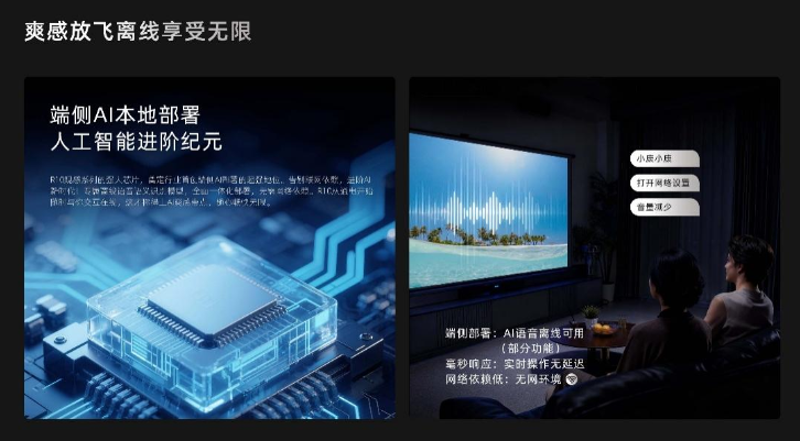 在不同使用场景中,R10的端侧AI展现出极强的适应性,真正实现全场景自主响应。比如当家庭网络中断时,传统电视的AI功能瞬间“瘫痪”,而R10凭借专属离线模型,用户说出“打开中央一台”“调节音量至50”,电视可实现毫秒级响应,避免传统云端交互的延迟卡顿,彻底告别断网即变“哑巴电视”的尴尬。此外,即便在网络信号薄弱的偏远地区或户型复杂的家庭环境中,低算力场景下的端侧AI仍能高效运行,语音重连网络、离线操控设备等功能稳定可靠。这种从云端依赖到全场景自主的突破,让用户在任何环境下都能享受“语音即控、随说随应”的爽感,重新定义了智能电视的交互体验。