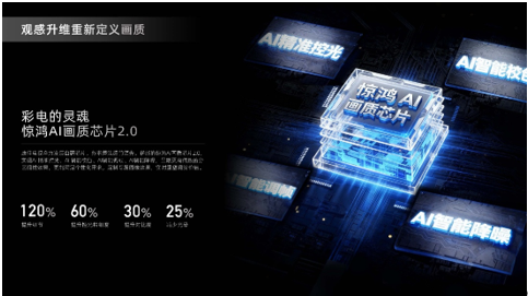 一是惊鸿AI画质芯片2.0,堪称画质优化的“智慧大脑”。作为画质提升的核心引擎,惊鸿AI画质芯片2.0具备四大核心能力:AI精准控光、AI智能校色、AI智能调帧、AI智能降噪。它不仅能呈现更高倍数的分区视觉效果,还可根据用户偏好定制专属图像,实时优化观赏体验。比如老人偏爱更柔和的亮度、孩子观看时自动开启护眼色彩模式、年轻人追综艺时强化色彩饱和度,真正实现“千人千面”的专属画质。经实测,该芯片可实现细节提升120%、控光精细度提升60%、对比度提升30%、光晕减少25%,让画质优势量化可见。
