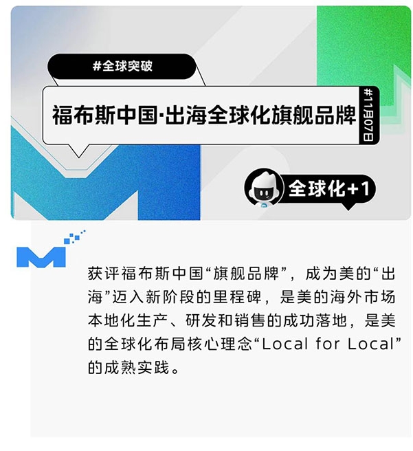 获评福布斯中国出海全球化“旗舰品牌”,是美的“出海”迈入新阶段的又一里程碑,也是对美的海外市场本地化生产、研发和销售与全球化布局核心理念“Local for Local”的认可。未来三到五年,美的还将进一步契合海外市场发展趋势,通过扩大生产规模,满足海外市场的实际需求,提升品牌竞争力,进一步推进中国企业出海的深度与高度。