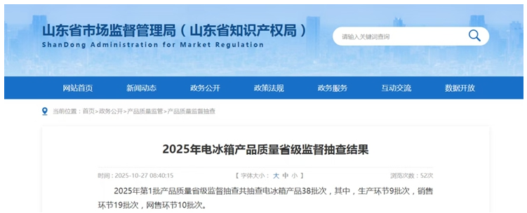 近日,山东省市场监管局网站发布2025年电冰箱产品质量省级监督抽查结果。2025年第1批产品质量省级监督抽查共抽查电冰箱产品38批次,其中,生产环节9批次,销售环节19批次,网售环节10批次。