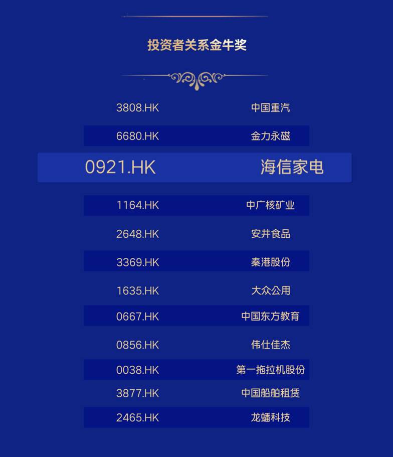 11月8日,由中国证券报主办的2025厦门产业发展大会暨金圆集团杯·上市公司(港股)金牛奖颁奖典礼在福建厦门举行,海信家电(HK 00921)获得“投资者关系金牛奖”。