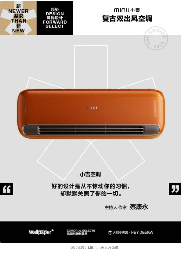 今年10月,MINIJ小吉新品复古双出风空调正式上市,近日又将「趋势风尚设计」奖收入囊中,引发了业界对其背景的新一轮关注——空调行业又有新玩家?
