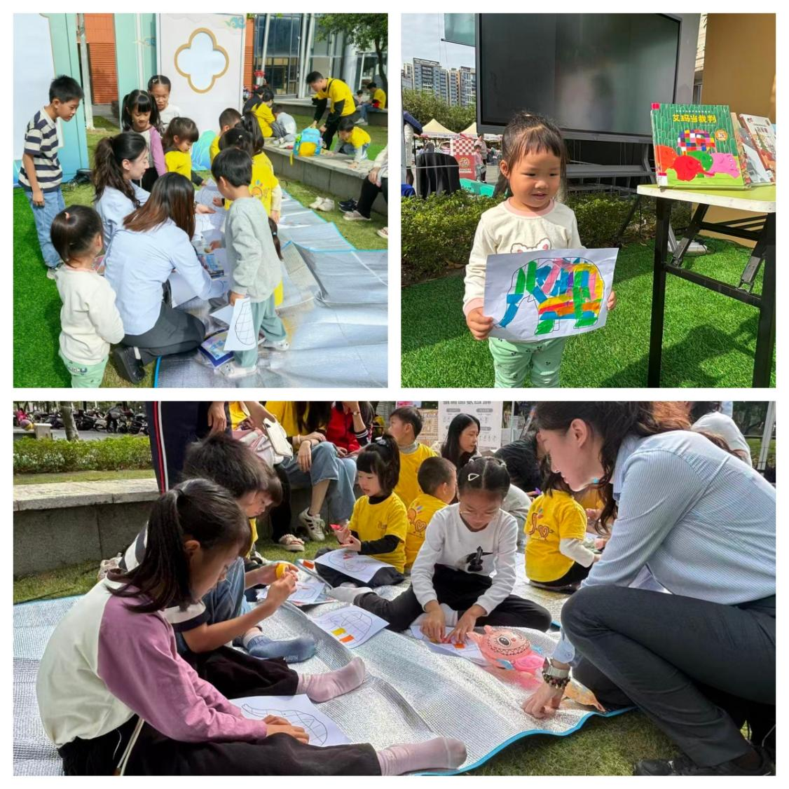 花格子大象艾玛的故事深受小朋友们的喜爱。在林老师的带领下,小朋友们通过“运动会里有什么”小游戏和十五运会答题挑战迅速融入活动。在随后的绘本共读环节,大家跟随艾玛的脚步,走进小象赛跑的奇妙世界,小朋友们在互动中思考公平与竞争的关系。最后的贴纸手工创作中,每个小朋友都制作出独一无二的“花格子大象艾玛”。
