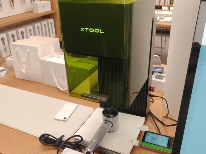 以「DIY」为例:徕芬直接在旗舰店里准备了一台 xTool 激光雕刻机,为用户提供文字、图案的激光镌刻服务:用户购买产品后可以扫码上传图片,在工作人员的帮助下为产品打上赠言。未来,徕芬也会在更多门店里提供更丰富的个性化服务。