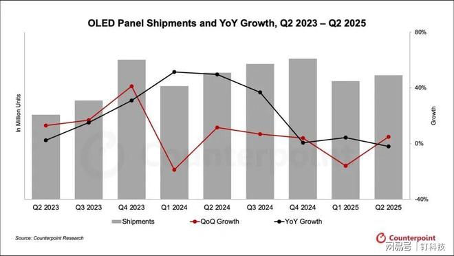 近年来,钉科技注意到,中国OLED产业发展迅猛,京东方、维信诺、TCL华星、天马等公司通过产能扩张、技术创新、客户拓展,大幅提高了中国OLED产业在全球市场的份额与地位。其中,京东方OLED出货量市场份额已经稳居中国第一,全球市场也仅低于三星显示。Counterpoint Research披露的2025年第二季度全球OLED面板出货情况显示,京东方以15%的出货量份额位居全球第二。