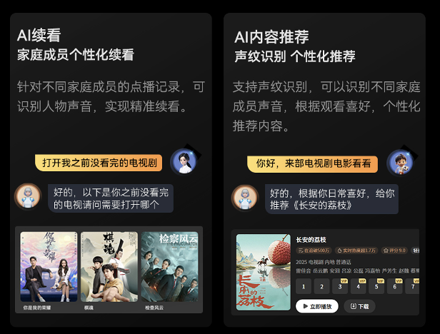当你正苦恼于你看过的一部电影但忘记了名字时,AI超级搜索3.0将会精准地告知你是什么。比如你可以问:“程序员送外卖是哪部电影?”智能体会精准地告诉你是《逆行人生》,并且不仅限于模糊搜索。超级搜索3.0的声纹识别技术能为每一个家庭成员提供专属服务:语音直达解决长辈不会用的烦恼,适龄内容推荐保护孩子的使用健康,不同成员拥有专属声纹推荐,记住您家庭的每一个爱好。