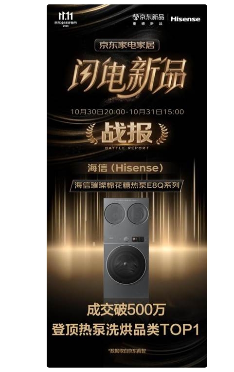 今年“双十一”大促期间,海信洗衣机交出一份亮眼的成绩单。在京东双十一战报中,在10月30日20:00-10月31日15:00,海信璀璨棉花糖热泵E8Q系列成交破500万,登顶热泵洗烘品类TOP1!展现出在消费升级趋势下,技术创新对市场格局的深刻影响。