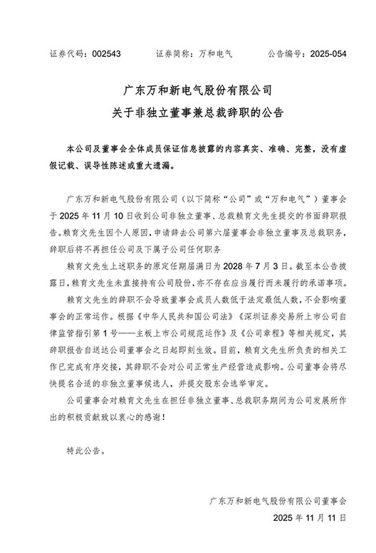 11月11日,广东万和新电气股份有限公司发布公告称,公司非独立董事、总裁赖育文因个人原因辞职,不再担任公司及下属子公司任何职务。