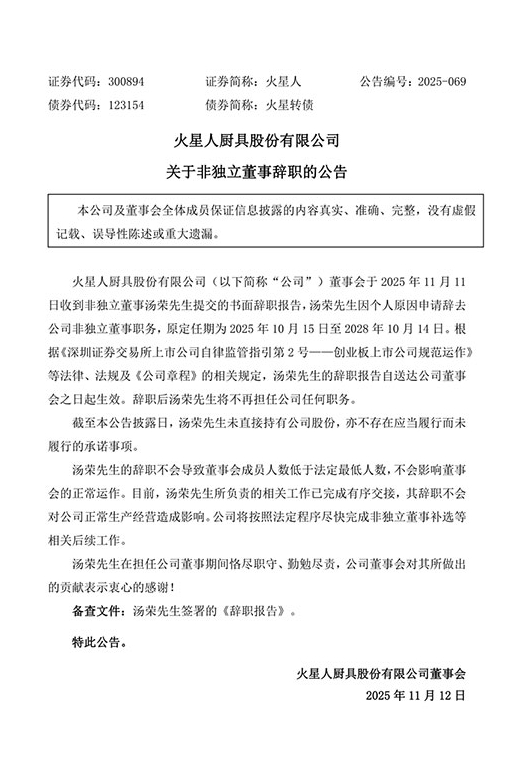 汤荣在今年10月15日才被聘任为火星人非独立董事,距离其辞职不到一个月时间。
