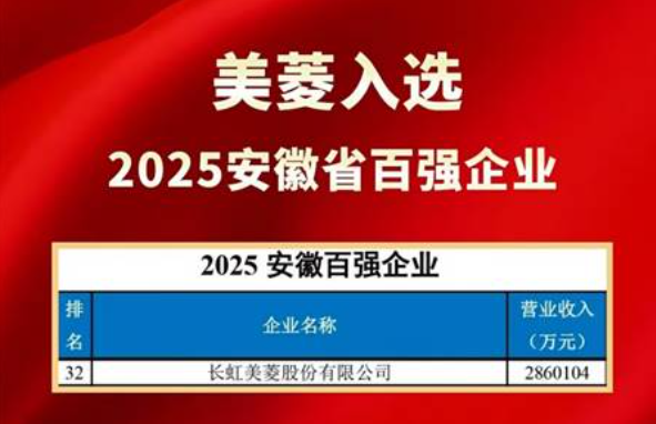 日前,2025年安徽省百强企业榜单在合肥发布,凭借去年的企业营收稳健增长,长虹美菱再次登上榜单,荣登安徽省百强企业榜单,再次彰显品牌发展硬实力。