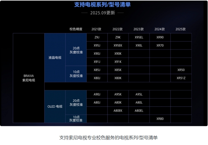 服务过程中,索尼工程师将使用Calman旗舰版软件、专业信号发生器与高精度探头,对电视的亮度、对比度、伽马、色温、色彩等参数进行精细化调校。该服务覆盖索尼液晶与OLED两大品类多款主流机型,可实现20点或10点灰度校准,满足不同用户的专业级色彩需求。