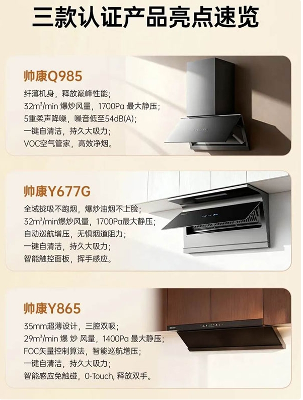 此次多款产品同步获得认证,标志着帅康在吸油烟技术、用户体验与健康标准三大维度上的不断进步。未来,帅康将继续秉持"科技为人,创造健康美好生活"的品牌理念持续推进产品创新与技术升级,为每一个中国家庭打造更健康、更智能、更舒适的厨房生活体验。