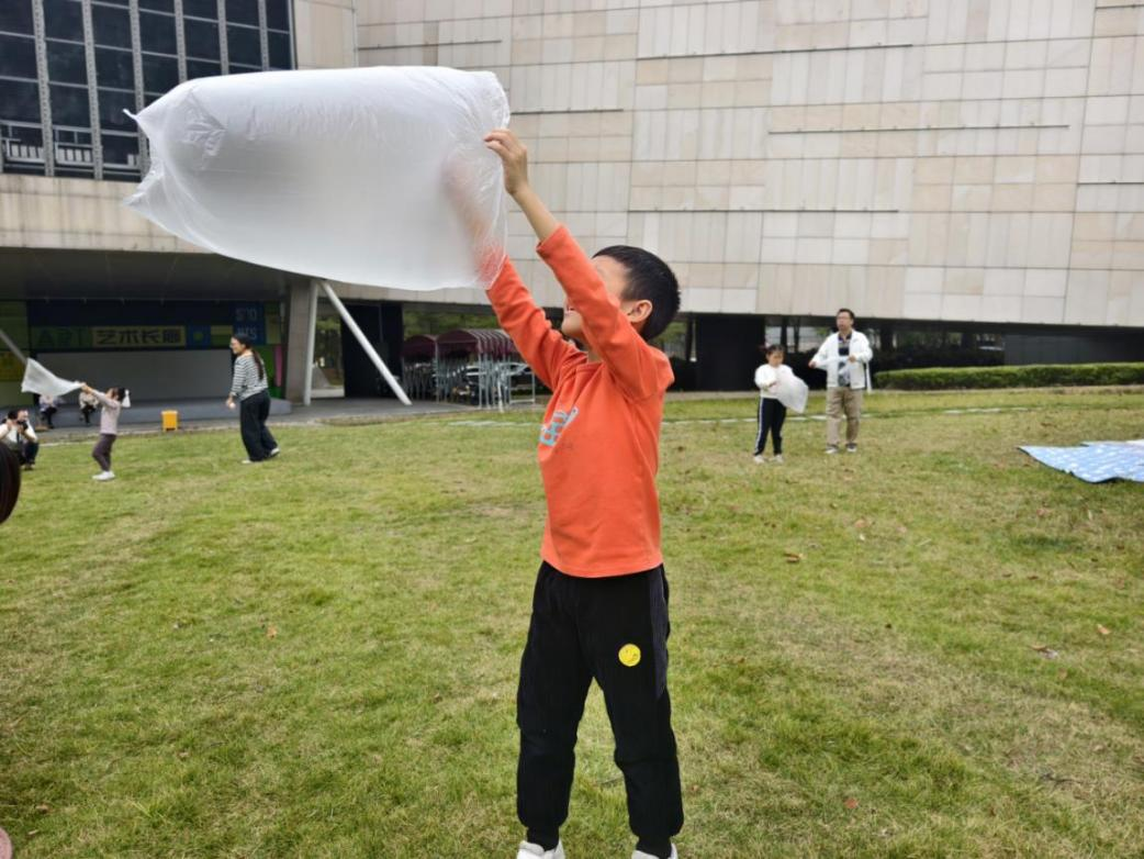 活动在亲子互动热身游戏“捕风行动”中展开。第一轮,孩子们不用手,靠奔跑让报纸“贴”在身上接力,亲身制造“风”的力量。第二轮,小朋友们用袋子装空气,捕捉看不见的“风”,直观感受空气的存在。简单游戏,激发孩子对风的奇妙感知!