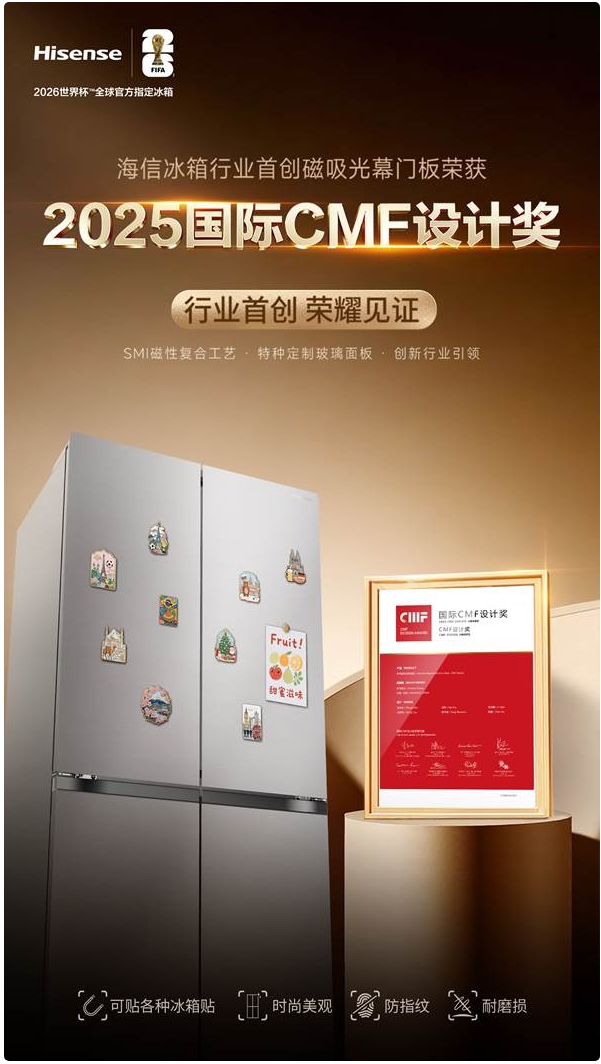 日前,全球设计领域权威奖项——2025国际CMF设计奖正式揭晓,海信冰箱全球首创的磁吸光幕门板凭借在材质、功能与情感体验的深度融合,成功斩获该奖项。这一荣誉不仅标志着中国家电设计实力获得国际认可,更彰显了作为2026世界杯™官方指定冰箱的海信始终以用户为中心的创新内核。