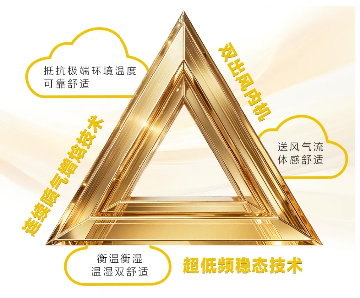 在这场由“舒适黄金铁三角”引领的变革中,作为行业代表之一的美的中央空调并未止步于“符合标准”。而是用三项扎实的技术,筑起了自己的护城河:国际领先的超低频稳态技术,让压缩机在低负荷下依然平稳运行,保证衡温衡湿的同时,更降低能耗;独家专利的连续喷气增焓,即便在极端气温下,也能保证制冷制热实力不衰减;行业首创的双出风机,不仅舒适静音,更是真正实现“暖从足起、凉而不直吹”的自然体感。这三者环环相扣,形成一个难以复制的系统体验闭环。