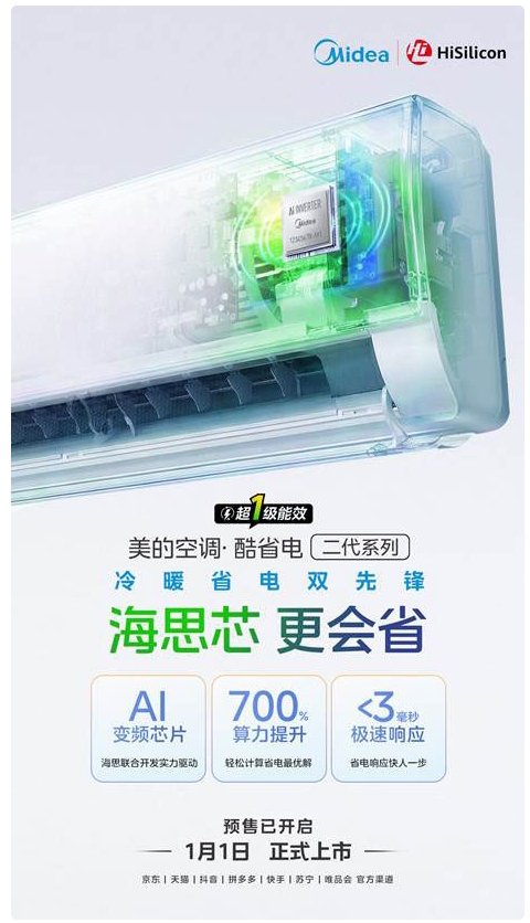 美的酷省电二代搭载由美的与海思联合研发的行业首款AI变频芯片,实现从“固定算法执行”到“本地实时决策”的底层跨越。这颗“强芯”,带来700%的算力提升,响应速度快至3毫秒,能实时感知室内温度、人员流动、不同家庭成员生活习惯等环境场景变化,本地瞬时计算出最优省电路径,如同给空调装上“超级大脑”,从根源上解决了传统空调响应延迟、节能低效的痛点。