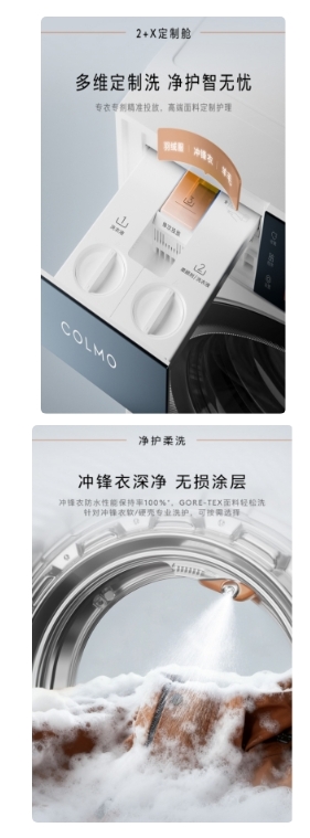 针对羽绒服、冲锋衣、羊毛等高端面料的衣物护理,COLMO图灵洗烘套装T1pro,创新搭载2+X定制舱,提供专衣专剂,智能精准投放,并配备AI智洗科技,能智能感知衣物重量,匹配洗涤剂投放量、洗涤时长等,为用户带来不同面料多维定制护理解决方案。