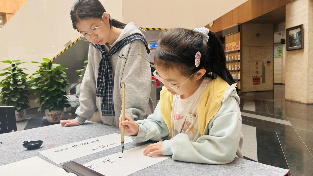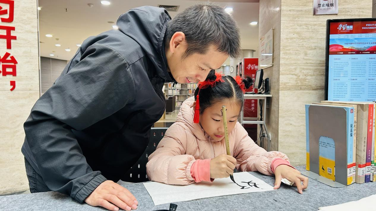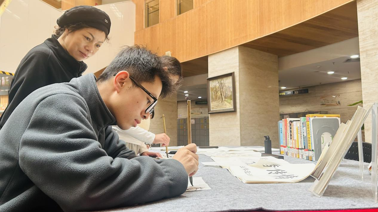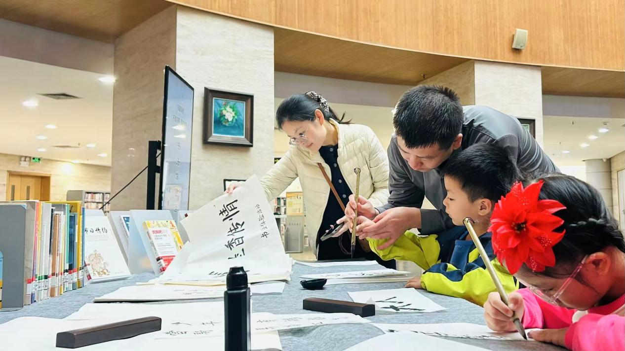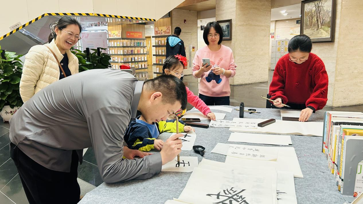 活动现场吸引了不同年龄段的读者驻足参与,既有挥毫泼墨的书法爱好者,也有亲子组合携手合作,家长手把手指导孩子握笔运腕,在一笔一划间感受书法的韵味与传统文化的魅力。现场展示了各类适合老年群体与青少年儿童的主题图书,方便读者借阅。既展现了传统文化韵味,又精准服务特殊群体,让书香与暖意萦绕佳节。